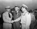 Image shows from left to right, Lieutenant Colonel Rafael Suarez, Mexico City, purchasing agent for the Mexican Air Force. Center is Dean E. H. Hereford, North Texas Agricultural College (NTAC) and right, Brigadier General Roger Ramey, commander of the 8th Air Force at the NTAC air field dedication at Grand Prairie. Published in Fort Worth Star-Telegram morning edition November 10, 1947.