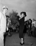 Image shows a Swift airplane presented at the dedication to the Texas Forest Service by, Colonel Harold Byrd, left, Dallas, Civil Air Patrol commander. Receiving the plane on behalf of the Forest Service is Miss "Texas" Lynn McClain, right, Lufkin. In foreground is unidentified crowd of onlookers. Published in Fort Worth Star-Telegram morning edition November 10, 1947.