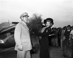 Image shows a Swift airplane presented at the dedication to the Texas Forest Service by, Colonel Harold Byrd, left, Dallas, Civil Air Patrol commander. Receiving the plane on behalf of the Forest Service is Miss "Texas" Lynn McClain, right, Lufkin. In foreground is unidentified crowd of onlookers. Published in Fort Worth Star-Telegram morning edition November 10, 1947.