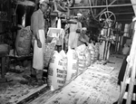Loading wheat and food donated by Carter Foundation. Unidentified men are standing in a ware house sealing and arranging bags of wheat . The men are wearing aprons on their outfits.