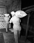 Loading wheat and food donated by Carter Foundation. Two unidentified men carrying bags of wheat on their shoulders and stacking them in a pile.