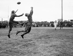 Image shows a Football Game between North Texas Agricultural College (NTAC) and John Tarleton Agricultural College. Sam Raglitto, right, John Tarleton, passes football backwards for Bog Hogan (NTAC). Published in Fort Worth Star-Telegram morning edition November 22, 1947.