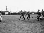 Image shows a Football game between North Texas Agricultural College (NTAC) and John Tarleton Agricultural College. NTAC's James (Steamboat) Howard, second from left, carrying football pushed Bill Gee, John Tarleton at game in Arlington. James Howard made four yards . John Tarleton Aggies won, 7-0. Published in Fort Worth Star-Telegram morning edition November 23, 1947.