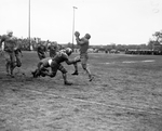 Image shows a Football Game between North Texas Agricultural College (NTAC) and John Tarleton Agricultural College. The shot shows a football player receiving a ball during the game.