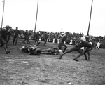 Image shows a Football Game between North Texas Agricultural College (NTAC) and John Tarleton Agricultural College. The shot shows four football players on ground, center, during football play.