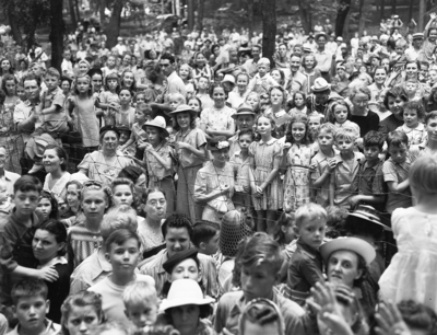Image shows The Forest Park Zoo celebrated the birthday of their elephant, "Queen Tut." A unidentified crowd is shown at Forest Park Zoo. Published in the Fort Worth Star-Telegram morning edition August 19, 1940.