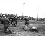 Image shows a Football Game between North Texas Agricultural College (NTAC) and John Tarleton Agricultural College. The shot shows nine football players on football field. In center, four football players are shown tackling player.