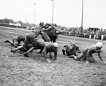 Image shows a Football Game between North Texas Agricultural College (NTAC) and John Tarleton Agricultural College. The shot shows ten football players on football field. The football players are shown tackling and on lying on field.
