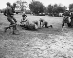 Image shows a Football Game between North Texas Agricultural College (NTAC) and John Tarleton Agricultural College. The shot shows seven football players on football field. The football players are shown tackling and on lying on field. On the right is unidentified onlookers on sidelines.