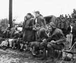 Image shows a Football Game between North Texas Agricultural College (NTAC) and John Tarleton Agricultural College. The shot shows unidentified football players seated and standing on sidelines. In foreground there is a unidentified crowd wearing rain coats .