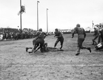 Image shows a Football Game between North Texas Agricultural College (NTAC) and John Tarleton Agricultural College. The shot shows six unidentified football players in football game. On far left is unidentified crowd on side lines.