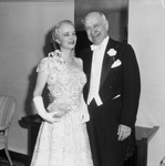 Mr. and Mrs. Amon Carter Senior. The couple are dressed in formal dinner outfits and are standing in front of a desk. Mrs. Carter is wearing a long dress with sequence on it, gloves and a ribbon attached to her shoulder. She is accessorized with a beaded necklace, stud earrings and she is holding a purse in her hand. Mr. Carter is dressed in a tuxedo with a bow tie. The couple are smiling as they pose for the camera.