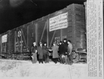 Shot made at arrival of train Chicago. A group of unidentified men standing outside a train carrying 15 carloads of food approved by the Fort Worth Texas Star-Telegram. Some of the men are dressed in overall while others are wearing overcoats on their outfits with ties and hats.