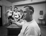 Texas Christian University (T. C. U.) basketball Coach Hub McQuillan giving instructions to starting lineup (from left) Bob Young, Brock Jarrell, Frank Kudlaty, Gene Schmidt and Nolan Weeks.