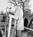 Amon Carter at mike( Other shots with Mr. Carter in background Mr. Carter is standing in front of the microphone with his hands in his coat pocket as he speaks. There are men seated behind him in the background. They are outdoors with a view of trees.