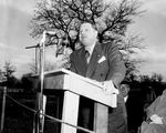 Grapevine Dam and Reservoir groundbreaking. An unidentified man wearing a suit and tie standing in front of a wooden podium speaking with the microphone. There are people seated behind him in partial view. They are outdoors and in the background, there are trees