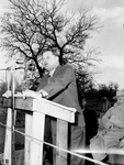 Grapevine Dam and Reservoir groundbreaking. An unidentified man wearing a suit and tie standing in front of a wooden podium speaking with the microphone. There are people seated behind him in partial view. They are outdoors and in the background, there are trees