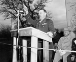 Grapevine Dam and Reservoir groundbreaking. An unidentified man wearing a military uniform, standing in front of a wooden podium speaking with the microphone with his right hand raised in the air and finger pointing forward. There are people seated behind him including Amon Carter. They are outdoors and in the background, there are trees