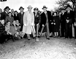 Grapevine Dam and Reservoir groundbreaking. Using a three-handled spade , left to right, Amon Carter Colonel Henry Hutchings Junior and John W. Carpenter of Dallas. The men are holding the spades in their right hand and are wearing overcoats on their suits with hats except Colonel Hutchings, who is in his military uniform. Behind the men are a group of unidentified people , adults and children.. Some of the people are squatting beside while others are standing.