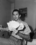 Basketball player Julias Dolnics, Texas Christian University (T. C. U.), holding letters.