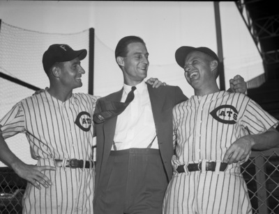 Frank "Scat" Metha, an old teammate from the 1939 pennant club, visited the Fort Worth Cats. The old infield, left to right, is Clyde "Rabbit" McDowell, Metha, and Buster Chatham. McDowell is the thirty year old second baseman for the Cats. Metha played third base for the Cats last season. Since leaving, he has split time between the Detroit Tigers and the minor league affiliate Beaumont Exporters where he plays second and third base. Chatham is a thirty-eight year old shortstop for the Cats. McDowell and Chatham are dressed in the Cats' home pinstripe uniform. Metha is wearing a suit.