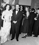 Party given by Nenetta Burton Carter. Amon Carter Jr. is seen wearing a tuxedo standing next to an unidentified woman wearing an evening gown at a party. There are other people in the background dressed formally for the event.