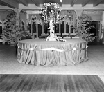 Party given by Nenetta Burton Carter. A picture of a decorated room with balls on Christmas trees and a round center table with a statue that has candlestick and flowers.