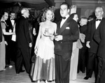 Party given by Nenetta Burton Carter. An unidentified couple holding glass cups in their hands while posing for the camera. The man is wearing a tuxedo while the woman is dressed in an evening gown. The woman is not looking directly towards the camera but is smiling while the man looks towards the camera with his mouth slightly opened. There are other people at the party in the background.