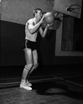 Darrow Hooper, Junior in Fort Worth North Side High School, basketball player shown in action shot. This tall junior is holding a basketball with his two hands, in what looks like an attempt to pass the ball. He his wearing his jersey, knee pads, and trainers with socks. Published in the Fort Worth Star-Telegram morning edition, January 4, 1948.