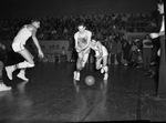 Paschal's Jim Rich (right) fouls Poly's Luther Scarborough while pursuing a free ball. In the picture, Rich uses his elbow to shove Scarborough's right arm. Both players put on Jersey number 3 from their different teams, knee pads, and socks with sneakers. A referee walks towards the players. There is also another player on the court headed for the ball. Spectators fill the gym bleachers. Rich's eagerness on the game cost him five personal fouls, but his mates won, 24-19. Published in the Fort Worth Star-Telegram morning edition, January 7, 1948.
