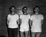 Masonic Home basketball players are (from left to right) Joe Broyles, Jimmy Pankhurst and Ralph Hendrickson. The three players stand next to each other in front of a brick wall with their hands behind them. Broyles is wearing a short sleeve shirt with long pants. Beside Broyles is Pankhurst who is wearing a short sleeve plain shirt with plain shorts. Next to Pankhurst is Hendrickson, who is wearing a plain short sleeve shirt with plain shorts.