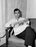 Members of the Fort Worth Cats, minor league baseball team go about their usual lives in the winter. Member, Moe Santomauro leisurely reads the Fort Worth Star-Telegram. He is just back from his Connecticut home and is catching up on Texas events. He is seated on a couch while reading a newspaper. He has his right leg crossed on his left and is wearing a collared shirt with long pants. He smiles as he poses for the picture. In the background is a curtain with barley patterns on it. Published in the Fort Worth Star-Telegram morning edition, January 11, 1948.
