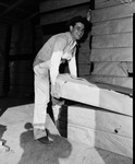 Members of the Fort Worth Cats, minor league baseball team go about their usual lives in the winter. Member, Willard Ramsdell working for a roofing firm. Ramsdell is lifting a package of roof shingles. He is wearing a long collared shirt, work gloves and long pants while he looks and smiles. Published in the Fort Worth Star-Telegram morning edition, January 11, 1948.