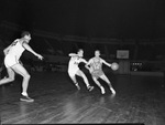 Texas Christian University (TCU) vs. University of Texas basketball game at the Will Rogers Memorial Coliseum with Slater Martin (15) and Bob Young (39). In the picture, Martin, fast, deceptive Texas star, tries to dribble around Young. There is an unidentified player in Jersey number 21 heading towards the two players. The Longhorns won, 45-39. Published in the Fort Worth Star-Telegram morning edition, January 14, 1948.