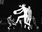 In this picture, TCU's Gene Schmidt, tall and blond holds ball in his hands with his leg in the air about to score a two pointer, Monday night game at the Will Rogers Memorial Coliseum. University of Texas' Al Madsen (16), makes an attempt to stop the shot with his right hand stretched to block the ball. Schmidt made the shot. There are other unidentified players in the background attempting to take action. University of Texas won the game 45-39. All the players are wearing their respective school's jerseys with sneakers and socks. Published in the Fort Worth Star-Telegram evening edition, January 13, 1948.