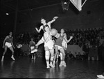 Paschal High School vs. Arlington Heights High School basketball game with Joe Burdett and O.A. Ryfle. In the picture, Ryfle(16) from Arlington Heights has the ball in hands while Burdett jumps with his two arms wide open trying to grab the ball from behind. There are other unidentified players on the court and an audience watching in the background. All players are wearing their respective school jersey, sneaker and socks, and some have knee pads. Published in the Fort Worth Star-Telegram morning edition, January 15, 1948.