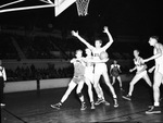 Baylor University vs. Texas Christian University (TCU) basketball game with Don Heathington, Nolan Weeks and Julius Dolnics. In the picture , Baylor's Heathington (15) has his left hand stretched out in front of Dolnics (21) trying to reach for the Ball while Dolnics has his two hands raised in the air with a scrunched up face. TCU's Weeks (36) uses his right hand and places it under Heathington's left arm in an attempt to stop him from getting the ball. There are other players on the court. All players are wearing their respective school jerseys, socks, sneakers,and some have knee pads. The Baylor Bears won, 52-48. Published in the Fort Worth Star-Telegram morning edition, January 21, 1948.