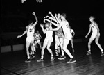 Baylor University vs. Texas Christian University (TCU) basketball game with Ralph Pulley (11), Bob Kudlaty (22) and Nolan Weeks (36). In the picture, Several players are scrambling to get the ball about to hit TCU's Kudlaty's face. There are other unidentified players on the court. All prayers are wearing their respective school jerseys, socks and sneakers. The Baylor Bears won, 52-48. Published in the Fort Worth Star-Telegram morning edition, January 20, 1948.