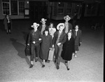 Texas Wesleyan College basketball players were accompanied by their girlfriends at the train station about to depart for a 19-day tour of the east. They are walking through the station in two rows, with the girlfriends next to them. The individuals are (front row, from left) Richard Cozad, Jimmie Williams, Douglas Higgins, and Ysleta Leissner, (back row, from left) Guinn Phillips, Jurene Lasiter and Jim Stroud and unidentified girl. They are dressed casually with the men wearing cowboy hats and boots, stripped shirts and jacket while the women have their dresses with coats and flat shoes.They all smile as they pose for the photograph. Published in the Fort Worth Star-Telegram morning edition, January 22, 1948.