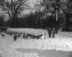Michael and Nancy Carrol Watson feed ducks at Fort Worth's Trinity Park after snowfall, 01/26/1948