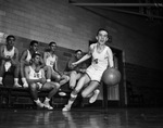 Arlington Heights High School basketball player Buddy Wise with his coach N. J. Hogan watching in the background. In the picture, Wise bounces the ball while running with an excited look on his face. He is wearing Jersey number 4, socks, and sneakers with a bandage a little below his right knee. There are other unidentified team members seated on the bench with his coach watching him play. Published in the Fort Worth Star-Telegram evening edition, January 28, 1948.