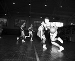 Arlington Heights High School vs. Polytechnic High School basketball game with Billy Gault and Bobby Rainbolt. In the picture Arlington Heights' Rainbolt (no. 3) dribbles past Poly's Gault with his eyes focused in the direction he is headed. There are other unidentified players running on the court. All players are wearing their school jerseys with socks and sneakers while some also have knee pads. Arlington Heights won the game and first half title of District 7-AA race, 38-30. Published in the Fort Worth Star-Telegram evening edition, January 29, 1948.