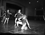 Container Corporation vs. City Refrigeration Company women's basketball game with Eloise Martin and Ophelia Pack. In the picture, Eloise of the Container Corporation, falls on a loose ball with Ophelia of the City Refrigeration team running right behind her. There are other unidentified players running on the court. The player uniforms of the Refrigeration's team logo "Westinghouse" showing on the left of their uniforms. Refrigeration team won, 23-20. Published in the Fort Worth Star-Telegram morning edition, February 7, 1948.