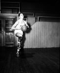 James Rich is one of Paschal High School's key basketball player. In the picture, Rich poses in front of a double door and a wood panel with a basketball in his hands and his right leg raised in a 90 degree position. He looks ahead with focus. He is wearing his school's jersey, socks with sneakers, and knee pads. Published in the Fort Worth Star-Telegram evening edition, January 24, 1948.