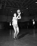 Weldon Basinger is Amon Carter Riverside basketball's veteran forward. In the picture, Basinger has a basketball in his left hand and uses his right hand for support while he lifts the ball up with his knees in a bent position. He is wearing Jersey number 10 with socks and sneakers. Basinger will sit out the basketball season as a result of leg injury. Published in the Fort Worth Star-Telegram morning edition, January 19, 1948.