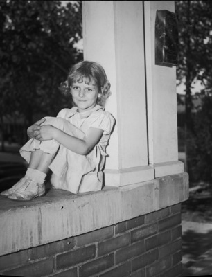 Joan Bartlett, 6 year old girl who rescued her play mate from drowning, is seen sitting outside on a stoop.