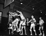 Amon Carter Riverside High School vs. Paschal High School basketball game with Aubrey Phillips, O.A Ryfle, and Jimmy Shelton. Paschal's Phillips comes down with the ball after a scramble with his teammate Ryfle. Riverside's Shelton (12) tries to grab ball from behind Phillips. There are other unidentified players on the court. The players are in front of the basketball net and are all wearing their school's jersey with pop socks and sneakers while some players have knee pads. Carter Riverside won, 33-31. The gymnasium has brick walls and divided-lite windows. Published in the Fort Worth Star-Telegram evening edition, February 13, 1948.