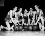 Here are the five starters of Poly's District 7-AA championship cage squad. In the picture, the five players are kneeling on one knee and have the other leg in a 90 degree position smiling at the camera. There are five basketballs in front of them and each player has their hands on one. They are all wearing jerseys with their respective numbers on them. Left to right are Ben Tompkins, Jerry Nabors, Luther Scraborough, Bill Davis and Tommy Taylor. They make bi-district bid Tuesday. Published in the Fort Worth Star-Telegram morning edition, February 22, 1948