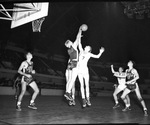 Texas Christian University (TCU) vs. Texas Agricultural & Mechanical University (TAMU) basketball game with Don Volding and Nolan Weeks. In the picture TAMU's Volding (30) and TCU's Weeks (7) battle to reach ball on a Saturday night's game at Will Rogers Memorial Coliseum. TCU won the game 46-41. There are other unidentified players on the court and all players are wearing their school's jersey, sock with sneakers and some players have knee pads. In the background is the audience watching and the basketball net to the left of the picture hanging from the backboard. Published in the Fort Worth Star-Telegram morning edition, February 23, 1948.