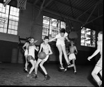 Richard O'Neal, leaping high, and Bobby Davis, left of Meadowbrook throw cordon around Nelson Stubblefield of Atomic Midgets, with ball as kids battle for city 12-and-under title at Recreation gym. Meadowbrook won, 16-15. There are other unidentified players on the court. The game was played by children under 12. Some of the kids are wearing shorts and a vest while some are shirtless. In the background, there are divided-lite windows and the basketball net, to the left of the photo hanging from the backboard. Published in the Fort Worth Star-Telegram morning edition, February 29, 1948.